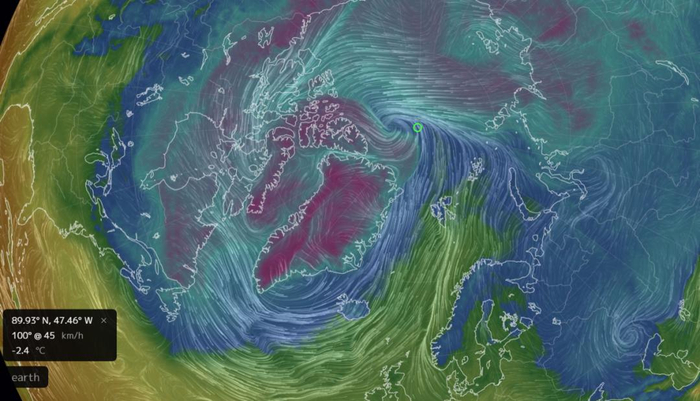 和南极直接的暖高压控制不同,北极这次异常升温靠的是一次强气旋的呼啸。
