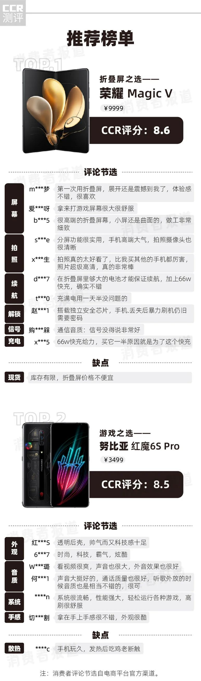 结果显示,荣耀 Magic V和努比亚 红魔6S Pro得到消费者较高评价。
