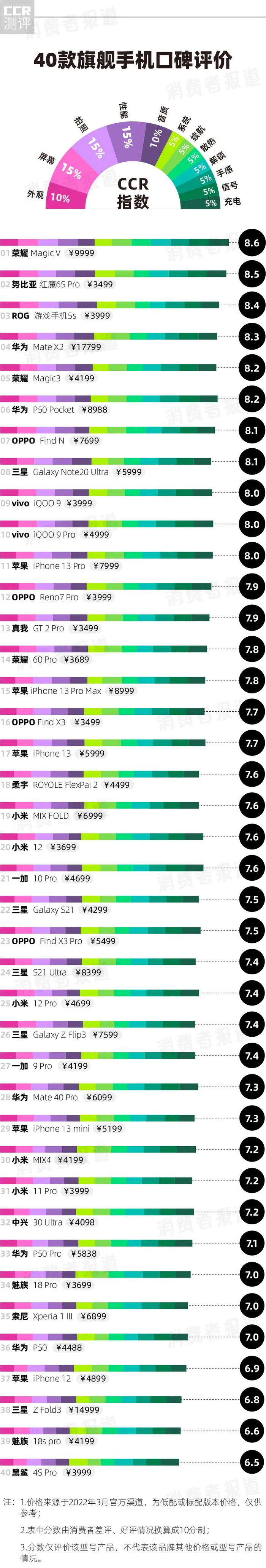 2022年3月,《消费者报道》汇总了京东、天猫、苏宁平台上的约12.5万条消费者评价数据,对市面上热销的40款3500元附近及以上的“旗舰手机”进行了分析、评价,给消费者推荐。
