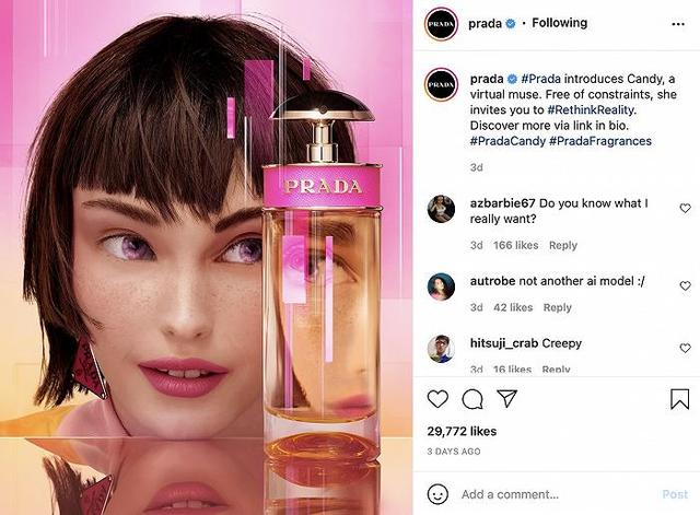 例如,2021年普拉达在社交平台上发布全新的Candy香水广告,并宣布使用全新的虚拟偶像代言人“Candy”。当时其业务负责人表示,使用虚拟偶像作为广告面孔,能够帮助品牌更好地吸引到Z世代的关注。