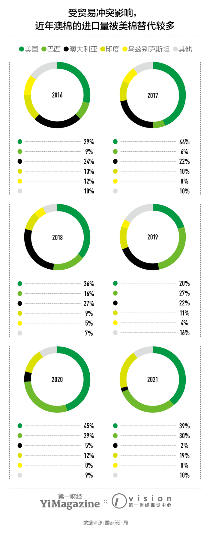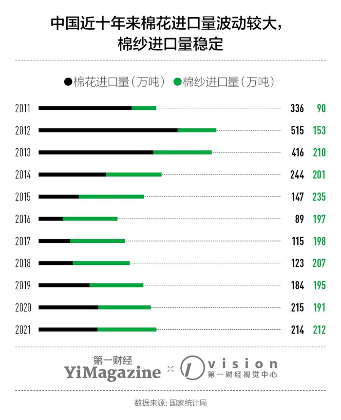 受繁荣的纺织业需求影响,中国的棉花长期供不应求,很少出口,每年还要进口棉花予以补充。国家统计局及中国棉花协会数据显示,在新疆棉花问题引发诸多讨论的2021年,中国进口了约214万吨棉花,其中美国棉花的占比接近40%。这一进口量与前一年基本持平,相较2019年则增长了16%。