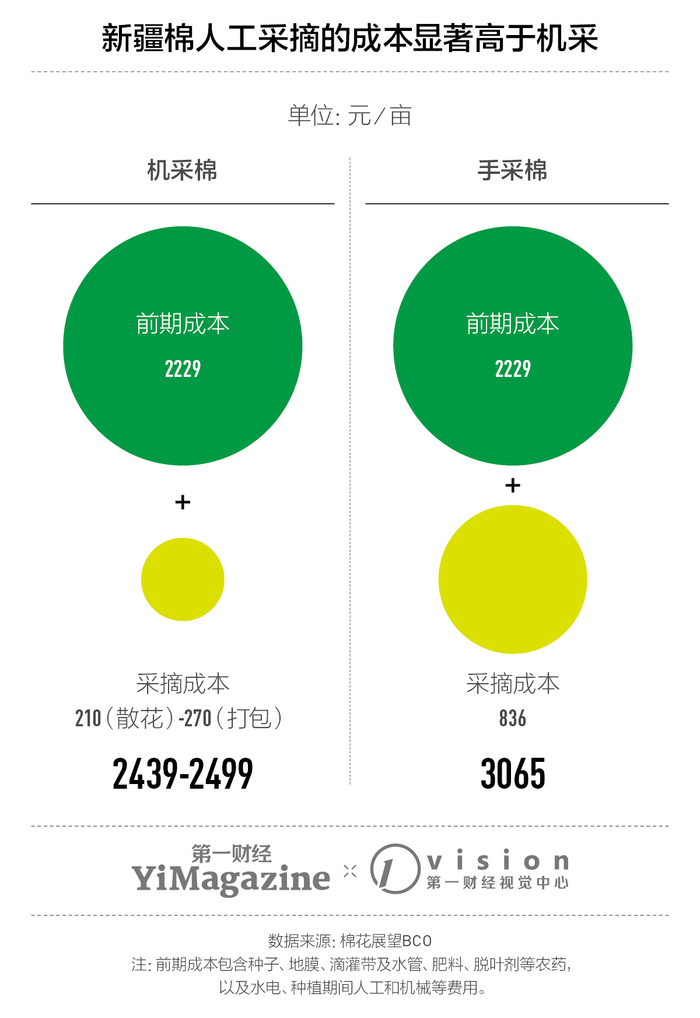 这是一个与产量挂钩的价格。在市场价格不占优的年份,越大的种植面积、越高的总产量和每亩产量,就意味着越高的补贴收入。按照田立文的估算,目前即使大规模机械化种植、采摘,由于其他环节价格上涨,新疆棉的前期成本已攀升至约15000元/吨的高位,差价补贴有时几乎就等于棉农的纯利润。