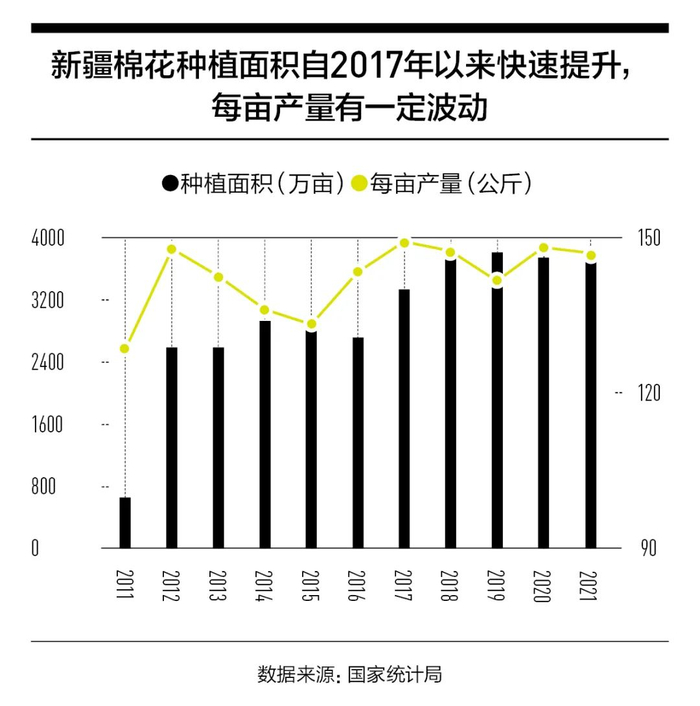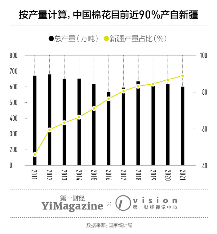 2021年,新疆的棉花种植面积已超过3700万亩,以产量计算,中国棉花目前近90%产自新疆。换言之,当讨论“中国棉花”时,所讨论的可等同于新疆棉花。