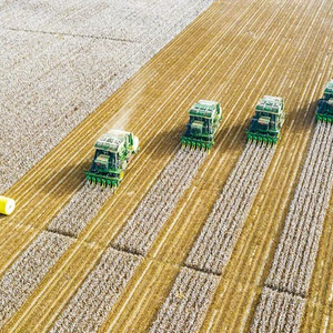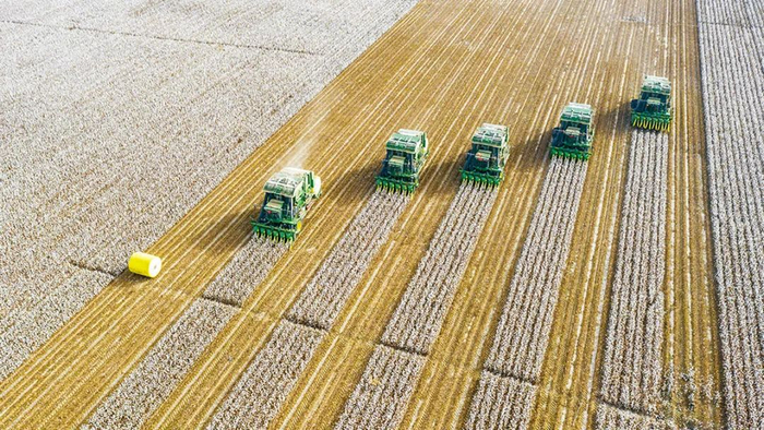 其次,得益于土地集中开发以及加速土地流转的一系列举措,新疆棉花多为上百亩、上千亩的规模化棉田。要大面积种植,必须推广机械化。目前在新疆,棉花的种植、管理、收获、加工等环节都已实现了机械化——春天,播种机将棉花种子与保暖保湿的地膜和浇水肥的滴灌带一起整齐地铺设在土地上;夏天,可以由无人机巡视田地情况、播撒农药;秋天,由无人机播撒落叶剂、促使棉花成熟后,再由采棉机将绽开的棉桃成批收获,“籽棉”会被送去轧花厂,由机器去除棉籽后制成可销售的“皮棉”;收割完成后,由机器打碎秸秆、回收地膜与滴灌带,再深犁土地,等待新一年的播种。