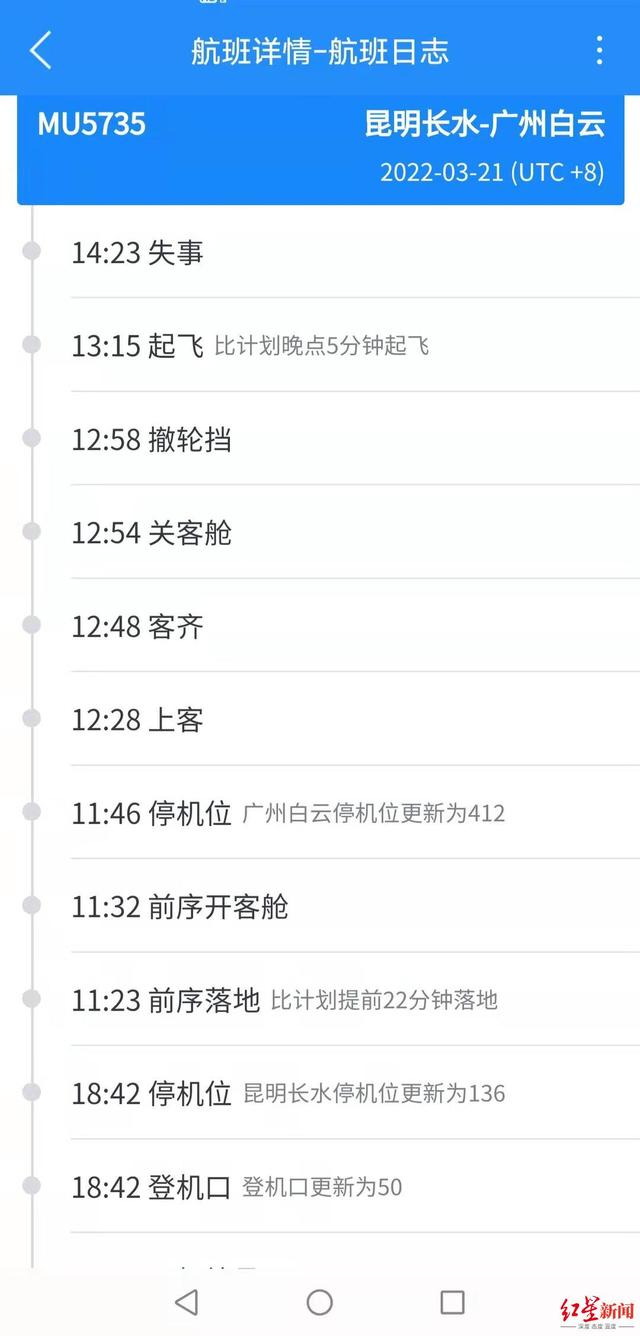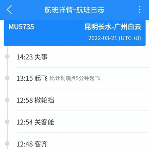 据“飞常准”业内版数据显示,3月21日中午12时28分,123位旅客从昆明长水国际机场50号登机口开始登机,他们要搭乘东航MU5735航班前往广州。