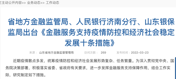 考虑到近期疫情散点多发,统筹疫情防控和经济社会发展形势复杂、任务繁重,山东金融局3月23日,联合人民银行济南分行、山东银保监局出台《金融服务支持疫情防控和经济社会稳定发展十条措施》,以进一步发挥金融服务支持保障作用。
