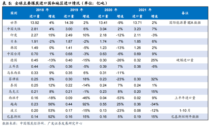 2010年以来,进口煤占我国煤炭表观消费量的比重在5-7%,进口煤已经成为我国煤 炭市场的重要补充,特别是在沿海省份煤炭消费中占比较高。2020年10月以后我国限制了澳洲煤进口,但总体进口量近2年仍保持了增长,2020-2021年分别进口了3.0亿吨(同比+1.8%)、3.2亿吨(同比+6.3%),主要由于增加了对印尼、俄罗斯等国煤炭的进口。其中,2021年我国增加进口印尼煤5474万吨(同比+39%),增加进口俄罗斯煤1743万吨(同比+44%)。