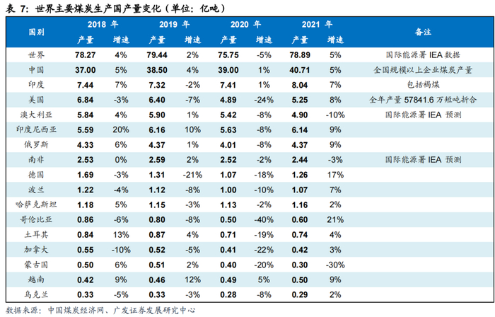 相比较煤炭消费端的快速回升(2021年世界煤炭消费量已超越疫情前的2019年),煤炭供给端恢复相对较慢。根据IEA数据,2021年世界各国煤炭总产量78.9亿吨,同比增长5%,仍未恢复到疫情之前的2019年生产水平,除中国、印度、印尼等少数国家煤炭产量有增长外,多数国家近4年来产量基本平稳或有减量。