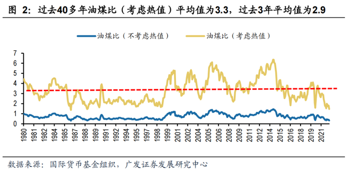 过去40多年,国际煤价和国际油价表现高度相关,油价弹性高于煤价,而国内煤价弹性较低。2000年以后,国际油价和煤价经历四轮周期变化,国际油价弹性相比较国内外煤价更高。从国际原油和国际煤价的比价关系来看,过去40多年油煤比(考虑热值)平均值为3.3,过去3年平均值为2.9,而最新比价约1.4。