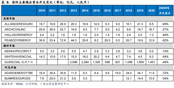 从海外主要煤企近10年来数据看,其资本开支情况也呈现周期变化,行业景气高点往往资本开支也较高,而在行业景气下行期资本开支有明显收缩。2020年受疫情影响,多数煤企资本开支都有明显下滑,较前期高点平均降幅近50%,而疫情之前的16-19年各煤企资本开支较上一轮周期也有下降,较低的资本开支也使得中长期扩产能力受限。