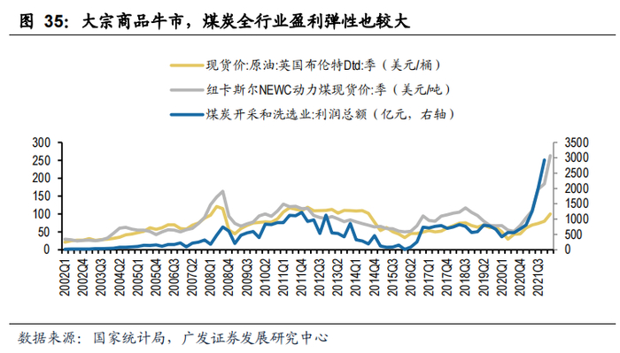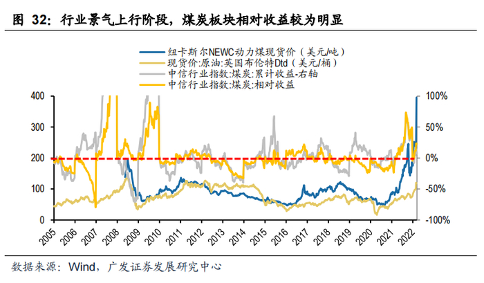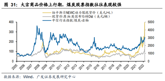 2005年以来,煤炭、原油等主要大宗商品经历的几轮周期中,行业景气上行阶段,煤炭股票指数也往往表现较强,其中2007年大宗商品牛市、2009年金融危机后国内四万亿财政刺激、2016-2017年煤炭行业供给侧改革的前2年,煤炭行业基本面上行,煤价持续上涨,煤炭板块绝对和相对收益突出,特别是2007和2009年煤价股价弹性明显。而近2年来,疫情之后国内外需求复苏较快,大宗商品普遍迎来新一轮周期,各产品价格创历史新高,股价的抢眼表现也是对基本面的映射。
