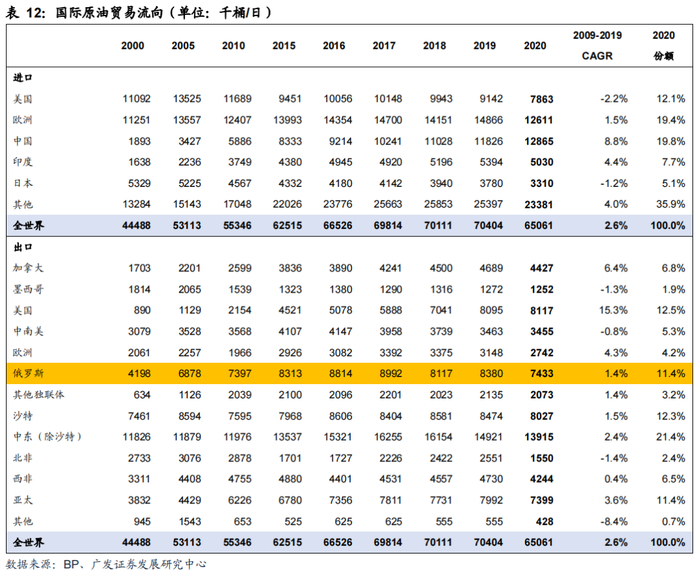 出口方面,2020年俄罗斯国内每天消费324万桶(占全球比重3.7%,占俄罗斯石油产量比重的30%),俄罗斯每天出口743万桶(占全球贸易市场比重11.4%),仅次于美国(812万桶/天,占比12.5%)和沙特(803万桶/天,占比12.3%)。出口去向来看,2020年俄罗斯总石油出口2.6亿吨,其中出口欧洲国家、中国的量分别为1.38亿吨、0.83亿吨,占比分别为53%和32%。而出口欧洲国家的石油量占欧洲消费量(6.03亿吨)的23%。