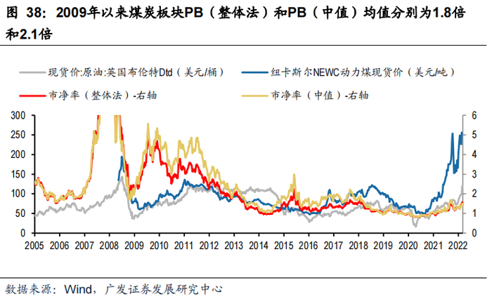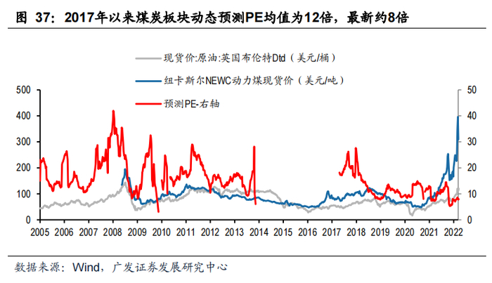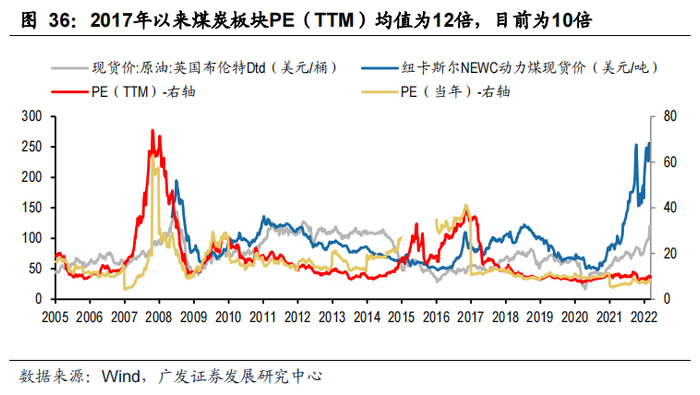 2016年以来,煤炭行业景气度回升,过去5年煤价中枢也有提升,特别是2021年煤价和煤炭公司盈利创新高,但板块PE估值变化不大,目前板块PE(TTM)和PE(当年)分别为9.6倍和8倍,较2017年以来均值折价约18%(2017年以来PE(TTM)和PE(当年)均值分别为12倍和8倍),历史上07-11年,煤炭行业成长性较好,同时煤价弹性较高的时候,PE估值中枢在20倍以上。
