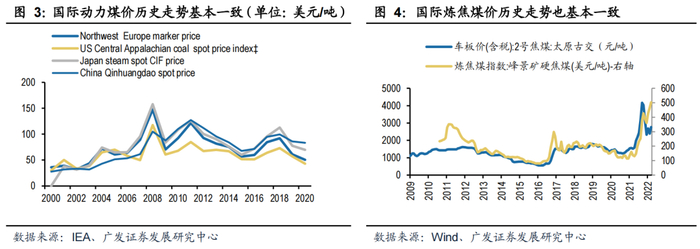 过去20年国内市场煤价和国际煤价相关性高,动力煤、焦煤走势也基本一致。主要由于在过去30年中,我国逐步世界上最大的煤炭生产国和消费国,以及最大的进口国,市场话语权和煤炭定价权影响较大。