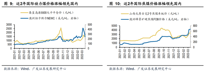 (1)动力煤方面,纽卡斯尔NEWC动力煤2021及2022年以来均价分别为139美元/ 吨(同比+130%)、263美元/吨(同比+89%),22年以来累计涨幅约45%,而国内秦港5500大卡煤价22年以来累计涨幅为98%,但2021及2022年以来均价分别为1030元/吨(同比+79%)、1123元/吨(同比+9%),涨幅明显小于国际煤价。