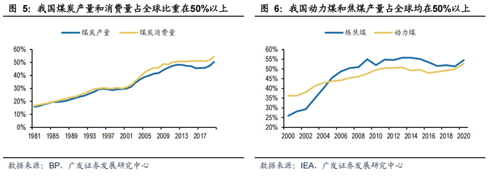 (3)2021年:我国煤炭产量和进口量分别达到41.3亿吨和3.2亿吨,同比增长5.7%和6.3%,2021年中国占全球煤炭产量和进口量分别达到52%和24%。相比30年前,我国煤炭总产量、分煤种的动力煤、炼焦煤产量、煤炭消费量占全球比重均从20%左右提升到50%以上。