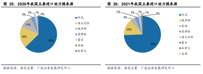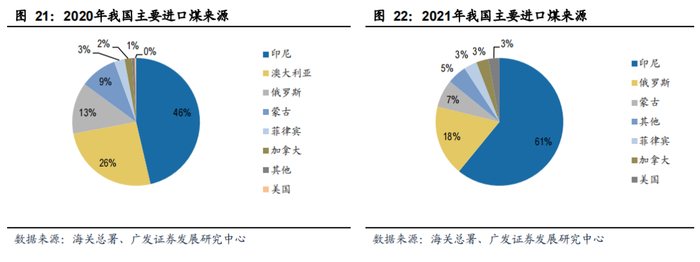 根据海关总署的数据,21年我国进口动力煤2.6亿吨,同比增加3600万吨或16%。虽 然澳洲煤进口煤受限,全年减量近3700万吨(同比-87%),但印尼煤进口增加5299万吨(同比+38%)、俄罗斯煤进口增加近1200万吨(同比+47%),印尼煤和俄罗斯煤进口占比进一步提升至74%和14%。