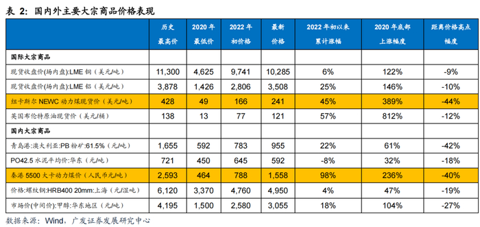 从国内外大宗商品价格表现来看,历史价格走势相关度高。2022年初以来,国内外煤价表现领先,累计涨幅分别达到98%和45%,涨幅明显大于除油价外的其他大宗商品。而从2020年价格底部开始,国内外煤价涨幅也处于前列,涨幅分别达到236% 和389%,仅低于国际油价(+812%)。不过,目前最新价格距离历史价格高点,国内煤价差距在40%以上,也大于多数大宗商品。