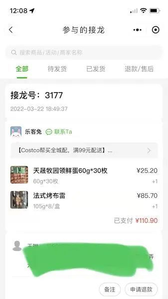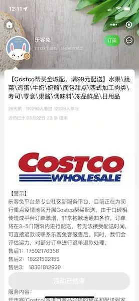 记者发现,小程序链接上的上架商品,有各种蔬菜、水果,鸡蛋牛奶等。活动方名称是“乐客兔”,为一家社区新服务平台,打出的活动名称是“costco帮买全城配”。页面中有一则通告:由于口碑相传造成平台订单激增。非常抱歉地通知各位,订单将在3—5日期限内进行配送,若无法接受配送时间,可直接退款或联系乐客兔。