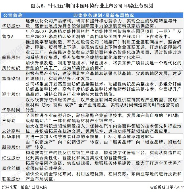 《中华人民共和国国民经济和社会发展第十四个五年规划和2035年远景目标纲要》中提出改造提升传统产业,扩大轻工、纺织等优质产品供给,完善绿色制造体系。深入实施增强制造业核心竞争力和技术改造专项,鼓励企业应用先进适用技术、加强设备更新和新产品规模化应用。建设智能制造示范工厂,完善智能制造标准体系。深入实施质量提升行动,推动制造业产品“增品种、提品质、创品牌”。中国印染行业上市企业以“十四五”规划为指导思想,对自身印染业务布局、整体企业发展做出了相应规划,从而顺应时代发展,提高经营效益。