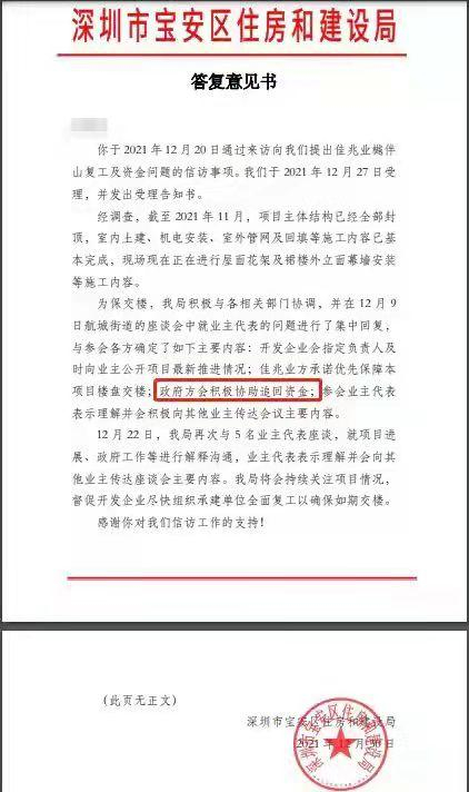 在深圳市宝安区住建局给业主的答复意见书里,有一句措辞能说明政府已认定资金被违规挪用——“政府方会积极协助追回资金”。