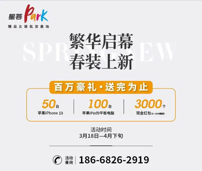 2月18日,春寒料峭,星荟精品女装基地三楼先导区有女装批发商家率先开业,春装全面上新。市场管理方为了感谢批发客户和消费者的厚爱,特别推出了大型返点和抽奖送手机、平板电脑的活动。