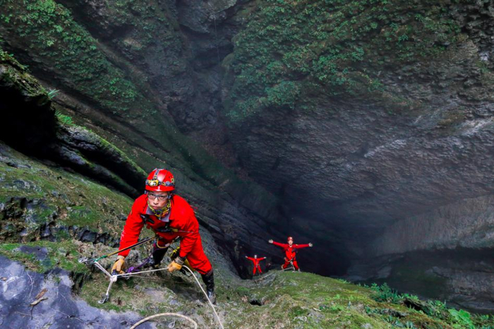 比起“探险”这样听起来充满趣味的活动,探洞更接近于一份有意思的工作,只有在大量重复单调的劳动之后,才会偶尔回报以惊奇。一些洞口太过狭窄,装绳索的大包无法通过,队员们只有一米一米地传递绳索,再重新整理装包,又一米一米地放出,向洞底探进。到达深处后,岩壁间回响起水声,随着空间的缩小,水声渐渐变大,刘佳形容那声音如洪水咆哮。竖洞最后转为仅可匍匐通过横洞,底部的沙石面上有清澈的流水,这里与洞口垂直距离841米。刘佳和队友们沉醉于欣喜之中,他们刷新了自己的探洞记录,但他们还不知道,随着万丈坑探洞的完成,中国垂直洞穴深度排行榜也被刷新了。