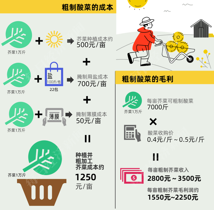 因此,一亩芥菜经过粗加工,可以卖2800元~3500元,纯毛利约1550元/亩~2250元/亩。