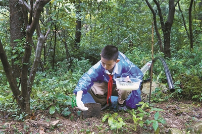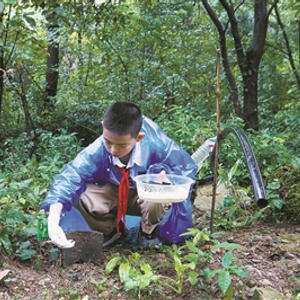 右图:北仑区的“红领巾”积极参与棘螈保护,将人工繁育的棘螈放归自然。