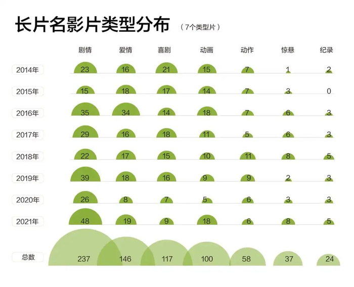 据统计,最喜欢用长片名的是剧情片,其次则是爱情片。但剧情片因为对类型划分表达比较笼统,有时会涵盖爱情、动作等类型,定位不算太精准清晰,所以可以忽略不计。