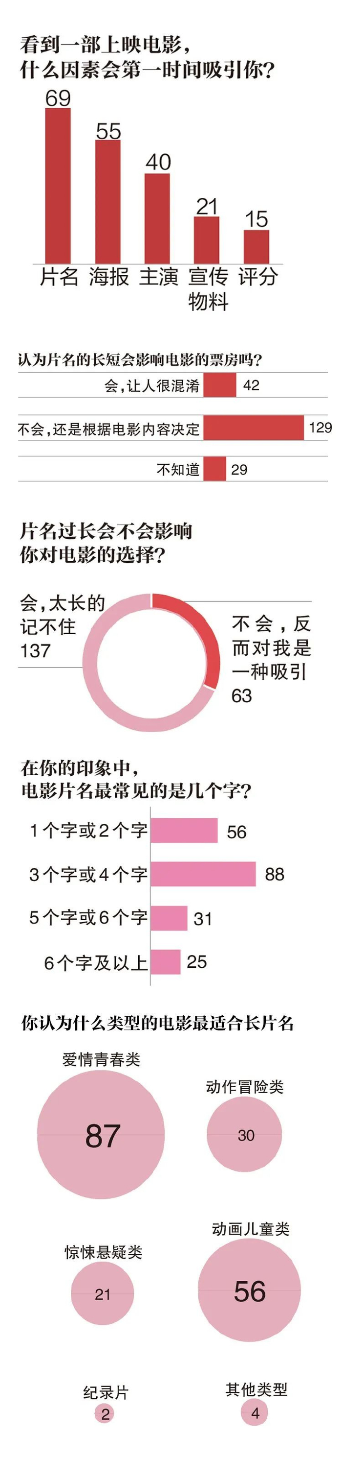 观众会根据电影片名对电影主题和内容进行猜测,进而决定是否看这部电影;电影制作方、发行营销方也想尽“花式”片名来吸引注意力。用一些言简意赅的话语难以精准表达电影核心内容,有时就会给电影取一个比较长的名字。