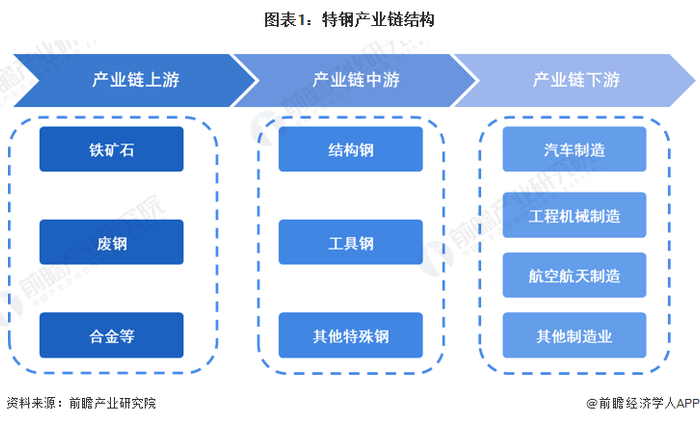 特钢产业链上游包括铁矿石、合金等原材料制造以及废钢回收再利用环节;中游是指特钢制造,包括结构钢、工具钢以及其他特殊钢的生产制造;产业链下游应用包括汽车、工程机械、航空航天等主要工业制造领域。