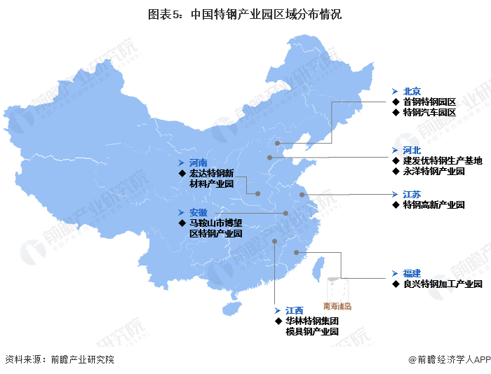 从我国现有的特钢产业园区的区域分布来看,主要集中在中东部地区,如河北邯郸的建发优特钢生产基地、江苏淮安的特钢高新产业园、安徽马鞍山市博望区特钢产业园、江西九江的华林特钢集团模具钢产业等等。