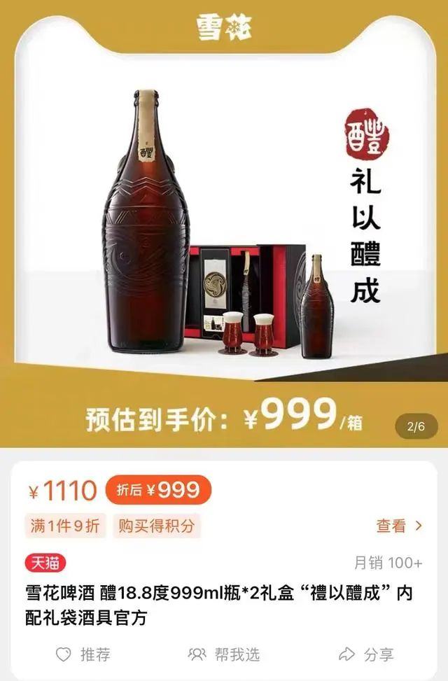 其中,超高端产品“醴”盒(两瓶)售价999元,华润啤酒CEO侯孝海曾在当时的产品发布会上表示:“醴在啤酒行业没有对标的产品,但醴与茅台同桌一点也不违和。”据淘宝雪花官方旗舰店显示,目前,这款礼盒月销仅100+。
