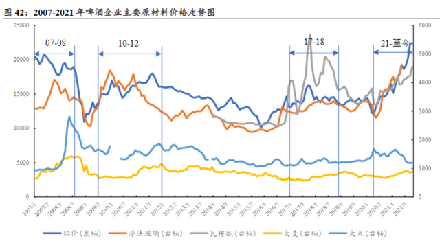对于包括华润啤酒在内的啤酒企业来讲,2022年面临的第一大风险因素就是原材料价格上涨。根据东北证券统计,2021年以来,啤酒主要原材料中铝、浮法玻璃、瓦楞纸价格大幅上涨,大麦价格也有所上升。