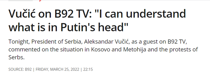 塞尔维亚B92电视台:武契奇在B92电视台节目中说,“我能理解他头脑里在想什么”