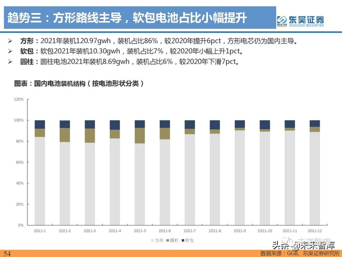 2021年动力电池产量220gwh,同比+220%:根据动力电池产业联盟,2021年动力电池产量为220gwh, 同比大增170%,其中磷酸铁锂电池产量为125gwh,同比增长267%,占比57%,同比提升15pct;三元电 池产量为94gwh,同比增长100%,占比43%,同比下降15pct。