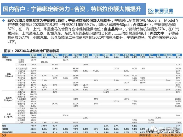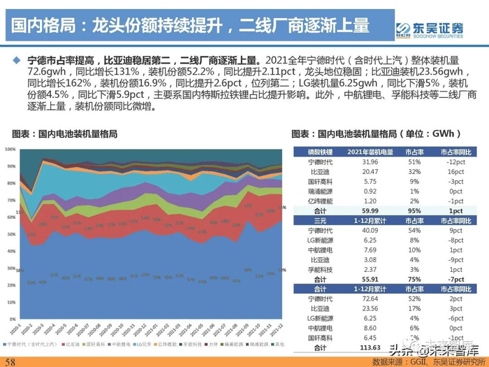 宁德市占率提高,比亚迪稳居第二,二线厂商逐渐上量。2021全年宁德时代(含时代上汽)整体装机量 72.6gwh,同比增长131%,装机份额52.2%,同比提升2.11pct,龙头地位稳固;比亚迪装机23.56gwh, 同比增长162%,装机份额16.9%,同比提升2.6pct,位列第二;LG装机量6.25gwh,同比下滑5%,装机 份额4.5%,同比下滑5.9pct,主要系国内特斯拉铁锂占比提升影响。此外,中航锂电、孚能科技等二线厂商 逐渐上量,装机份额同比微增。