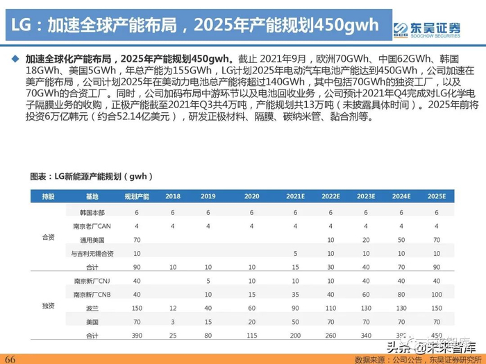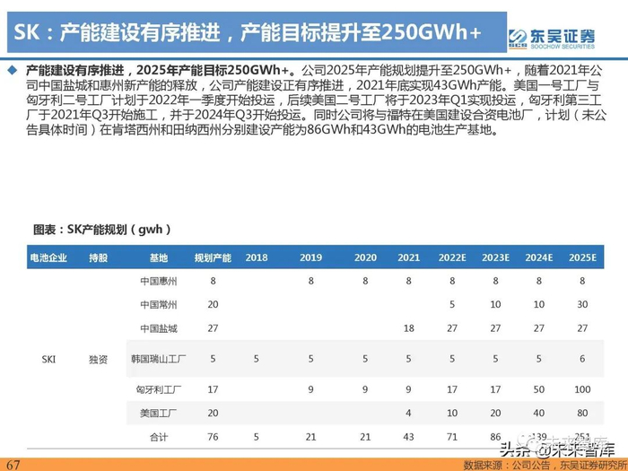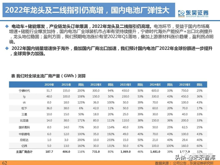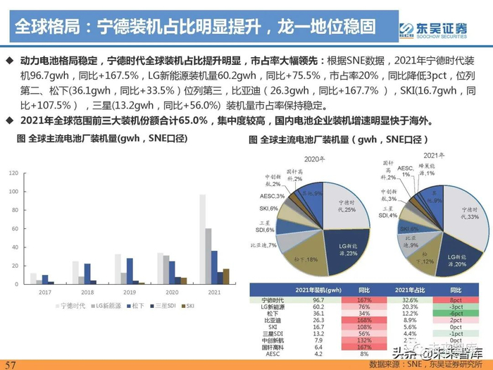 动力电池格局稳定,宁德时代全球装机占比提升明显,市占率大幅领先:根据SNE数据,2021年宁德时代装 机96.7gwh,同比+167.5%,LG新能源装机量60.2gwh,同比+75.5%,市占率20%,同比降低3pct,位列 第二、松下(36.1gwh,同比+33.5%)位列第三,比亚迪(26.3gwh,同比+167.7% ),SKI(16.7gwh,同 比+107.5%) ,三星(13.2gwh,同比+56.0%) 装机量市占率保持稳定。 2021年全球范围前三大装机份额合计65.0%,集中度较高,国内电池企业装机增速明显快于海外。