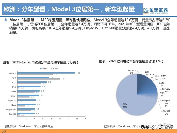 系三强占主导地位,MEB平台快速起量:2021年大众、戴姆勒、Stellantis在德国份额分别为34%、15% 、10%,在本国占领主导地位;特斯拉份额为6%,与2020年相比提升2pct。分车型看, Model 3(3.5万辆 ,同比+132%)、 up!(3.1万辆,同比+184%)、ID.3(2.7万辆,同比+84%)、ZOE(2.5万辆,同比19%),fortwo(1.7万辆,同比+51%)位居销量1-5位。