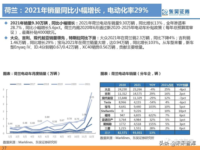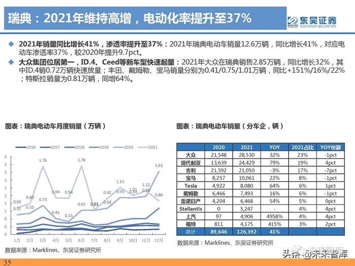 2021年销30.7万辆,同比增64%,渗透率达14.7%。2021年法国电动车销量30.7万辆,同比增长64%,全 年渗透率14.7%,同比上升5.5pct。法国2020年5月大幅增加电动车2020年下半年补贴,购车和置换分别提 高1000欧,最高补贴1.2万欧,2021年7月起补贴恢复至提高前水平,销量6月抢装效应明显。