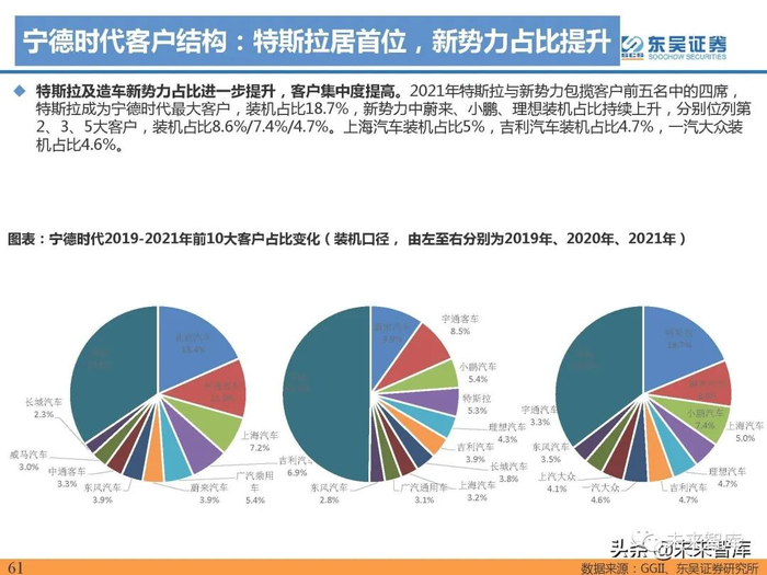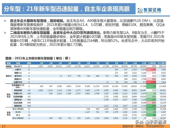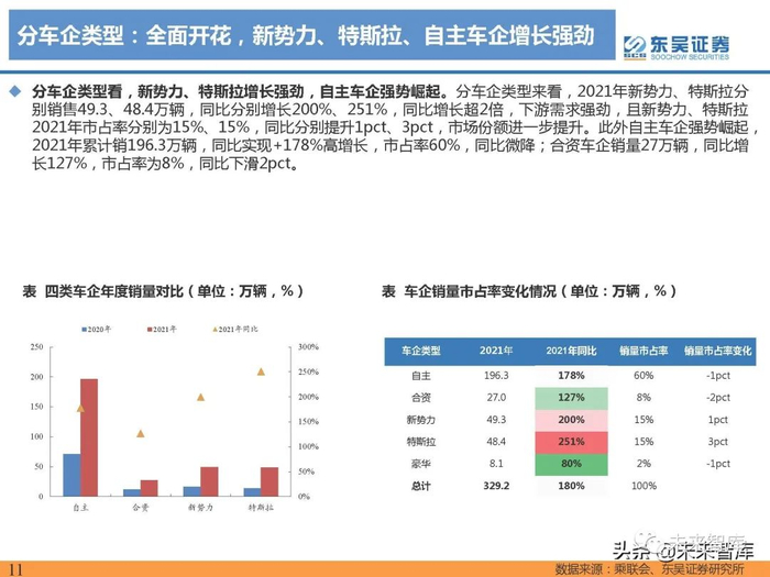 分车企类型来看,2021年新势力、特斯拉分 别销售49.3、48.4万辆,同比分别增长200%、251%,同比增长超2倍,下游需求强劲,且新势力、特斯拉 2021年市占率分别为15%、15%,同比分别提升1pct、3pct,市场份额进一步提升。此外自主车企强势崛起, 2021年累计销196.3万辆,同比实现+178%高增长,市占率60%,同比微降;合资车企销量27万辆,同比增 长127%,市占率为8%,同比下滑2pct。(报告来源:未来智库)