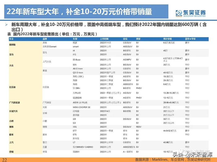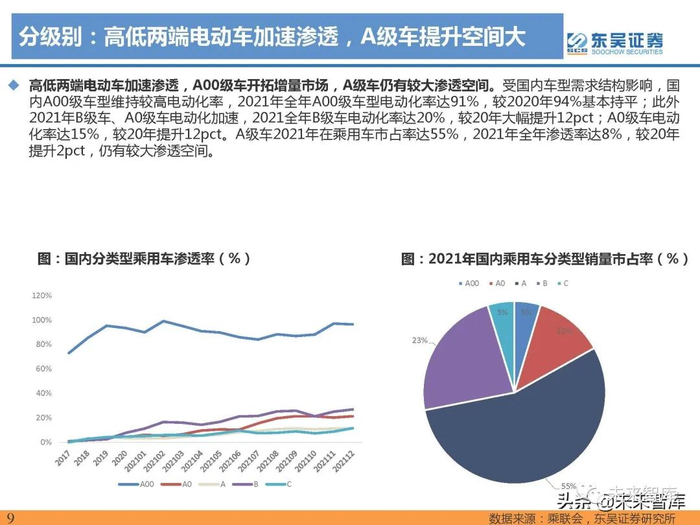 高低两端电动车加速渗透,5-15万元价格带车型仍有较大渗透空间。受国内车型需求结构影响,国内0-5万 元车型、25-30万元车型为电动化进程最快的车型价格带,2021年全年我国0-5万元车型电动化渗透率达 68%,同比增长35pct,15-20万元、20-25万元、25-30万元电动车渗透率均处于20%左右,分别为18%、 16%、21%,A级车对应的价格带5-15万元2021年电动化率仍在10%以内,有较大渗透空间。