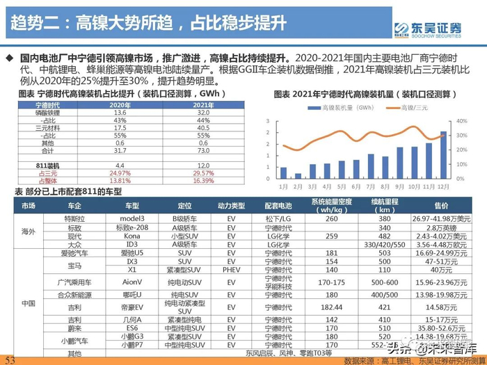 2021年三元材料产量高增,高镍占比迅速提升至40%。根据鑫椤资讯,2021年正极材料总产量80万吨, 同比增长139%,其中三元正极材料产量为38万吨,同比增长102%,占比48%,同比下降9pct,主要受铁 锂回潮产量占比迅速提升影响。2021年高镍811正极产量达15万吨,占三元产量40%,同比提升15pct,高镍化为大势所趋,我们预计未来 高镍三元出货份额将进一步提升。