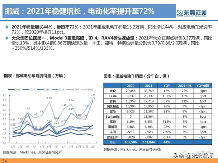 2021年销量增长44%,渗透率72%:2021年挪威电动车销量15.2万辆,同比增长44%,对应电动车渗透率 72%,较2020年提升11pct。