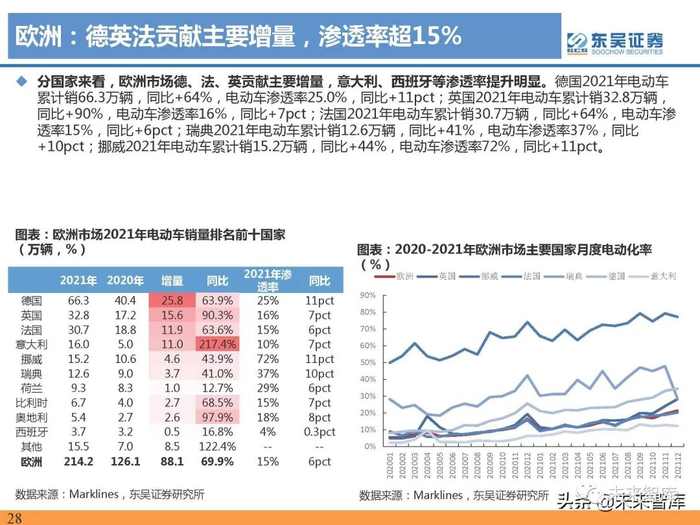 德国2021年销66.3万辆,同比增64%,电动化渗透率25%。2021年德国电动车销量66.3万辆,同比增长 64%,在欧洲市场销量占比31%,为欧洲第一,渗透率25%,较2020年提升11.4pct。德国2020年下半年起 政府补贴翻倍,大幅拉动电动车需求,电动车加速渗透。德