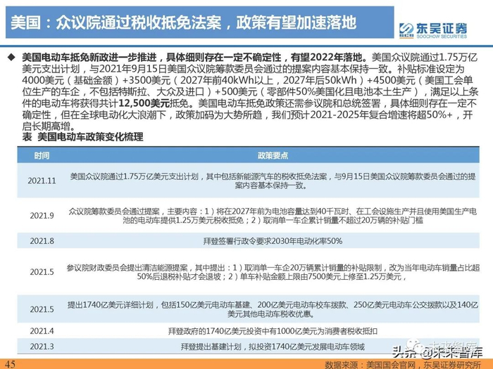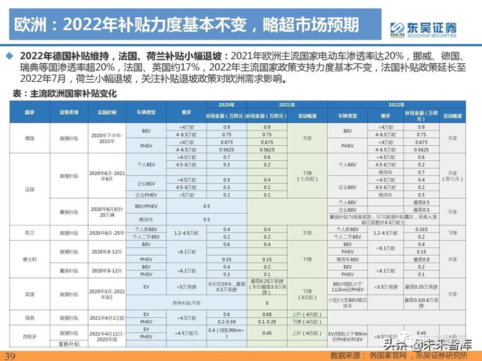 2021年销32.8万辆,同比增90%,补贴退坡不改增长趋势。2021年英国电动车销量32.8万辆,同比增90% ,电动车渗透率16%,同比+7pct 。英国补贴稳步退坡,2021年3月起补贴退坡500英镑,但明确补贴延续 至2023年,对销量影响较小。