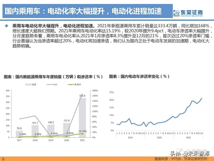 2021年新能源乘用车累计销量达333.4万辆,同比增加168%, 增长速度大超我们预期。2021年乘用车电动化率达15.19%,较2020年提升9.4pct,电动车渗透率大幅提升, 分月度趋势来看,乘用车电动化率从2021年1月渗透率8.3%提升至12月的21%,首次迈过20%渗透率门槛, 行业普遍认为当渗透率超过20%,电动化将加速渗透,我们认为国内正处于电动车发展的加速期,电动化大 趋势明确。