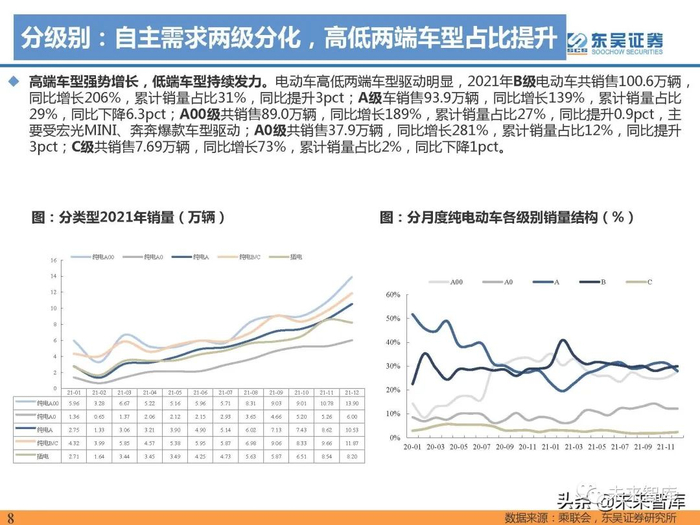 高端车型强势增长,低端车型持续发力。电动车高低两端车型驱动明显,2021年B级电动车共销售100.6万辆, 同比增长206%,累计销量占比31%,同比提升3pct;A级车销售93.9万辆,同比增长139%,累计销量占比 29%,同比下降6.3pct;A00级共销售89.0万辆,同比增长189%,累计销量占比27%,同比提升0.9pct,主 要受宏光MINI、奔奔爆款车型驱动;A0级共销售37.9万辆,同比增长281%,累计销量占比12%,同比提升 3pct;C级共销售7.69万辆,同比增长73%,累计销量占比2%,同比下降1pct。