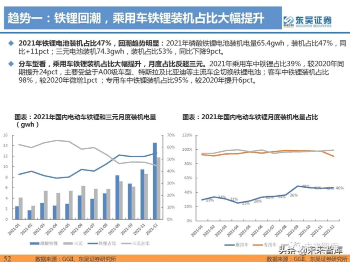 铁锂正极强势增长,产量占比反超三元。根据鑫椤资讯,2021全年正极材料总产量为80万吨,同比增长 139%,其中磷酸铁锂产量41.5万吨,同比增长188%,产量占比52%,同比+9cpt,反超三元,铁锂正极 材料产量的大幅增长得益于铁锂电池需求高增。(报告来源:未来智库)